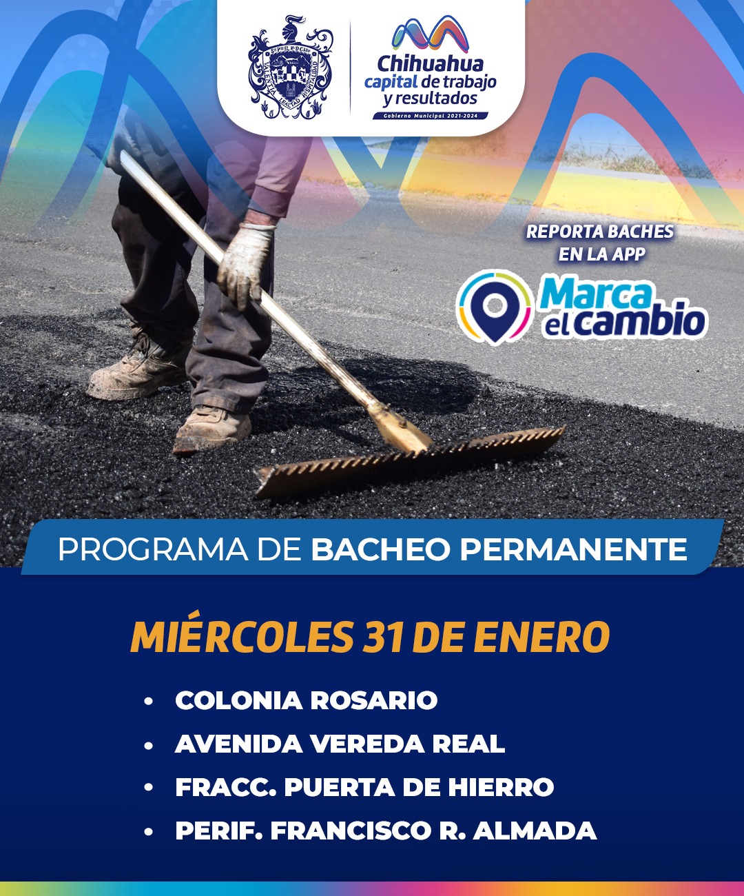Chihuahua, Chih. A 31 de enero de 2024.- El Gobierno Municipal, a través de la Dirección de Obras Públicas, continúa con el programa permanente de bacheo en diferentes zonas de la ciudad, con el objetivo de dar una respuesta eficaz a los baches reportados por los chihuahuenses.