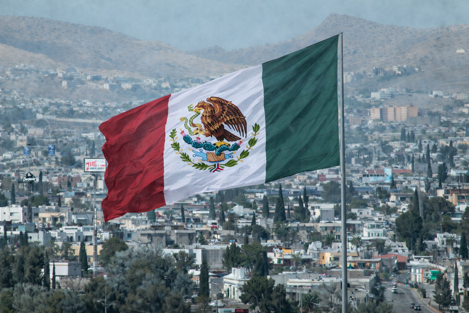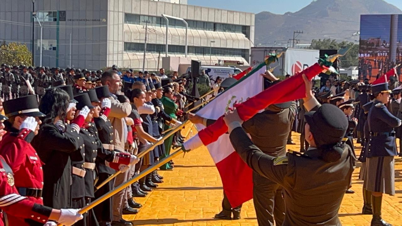 Bandera monumental ondea en El Palomar de Chihuahua