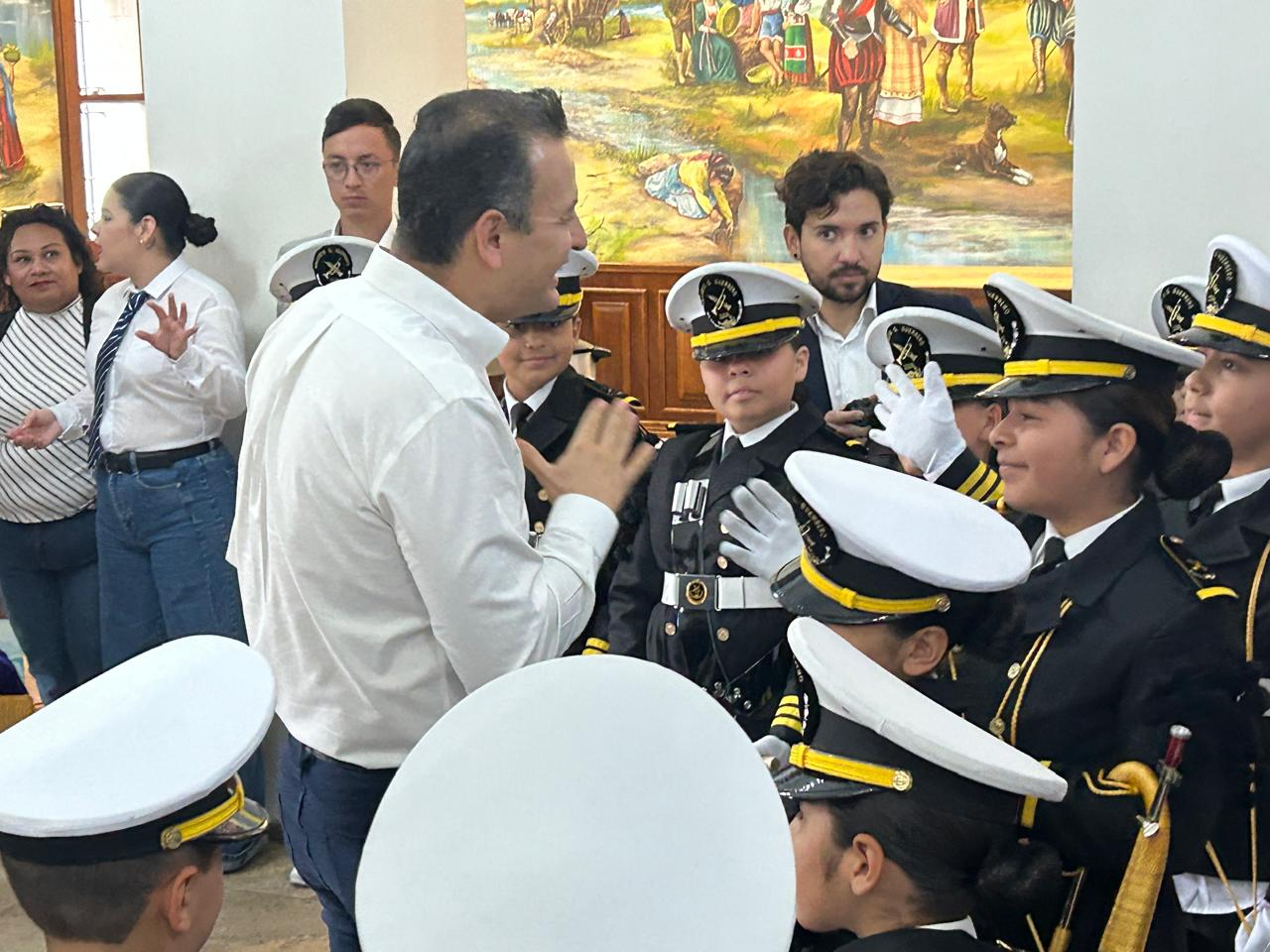 Marco Bonilla llega al evento “Niño Funcionario por un Día” y saluda a la banda de guerra de la Praxedis G. Guerrero