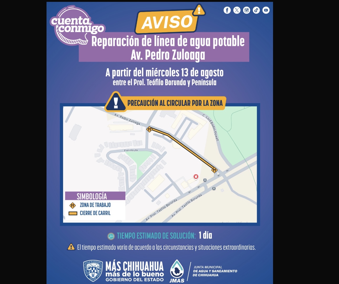 Inicia JMAS Chihuahua reparación de línea general de agua potable en avenida Pedro Zuloaga Personal de la Junta Municipal de Agua y Saneamiento (JMAS) de Chihuahua, iniciará este miércoles los trabajos para reparar la línea general de agua potable ubicada en la avenida Pedro Zuloaga. La obra se desarrollará entre [...]