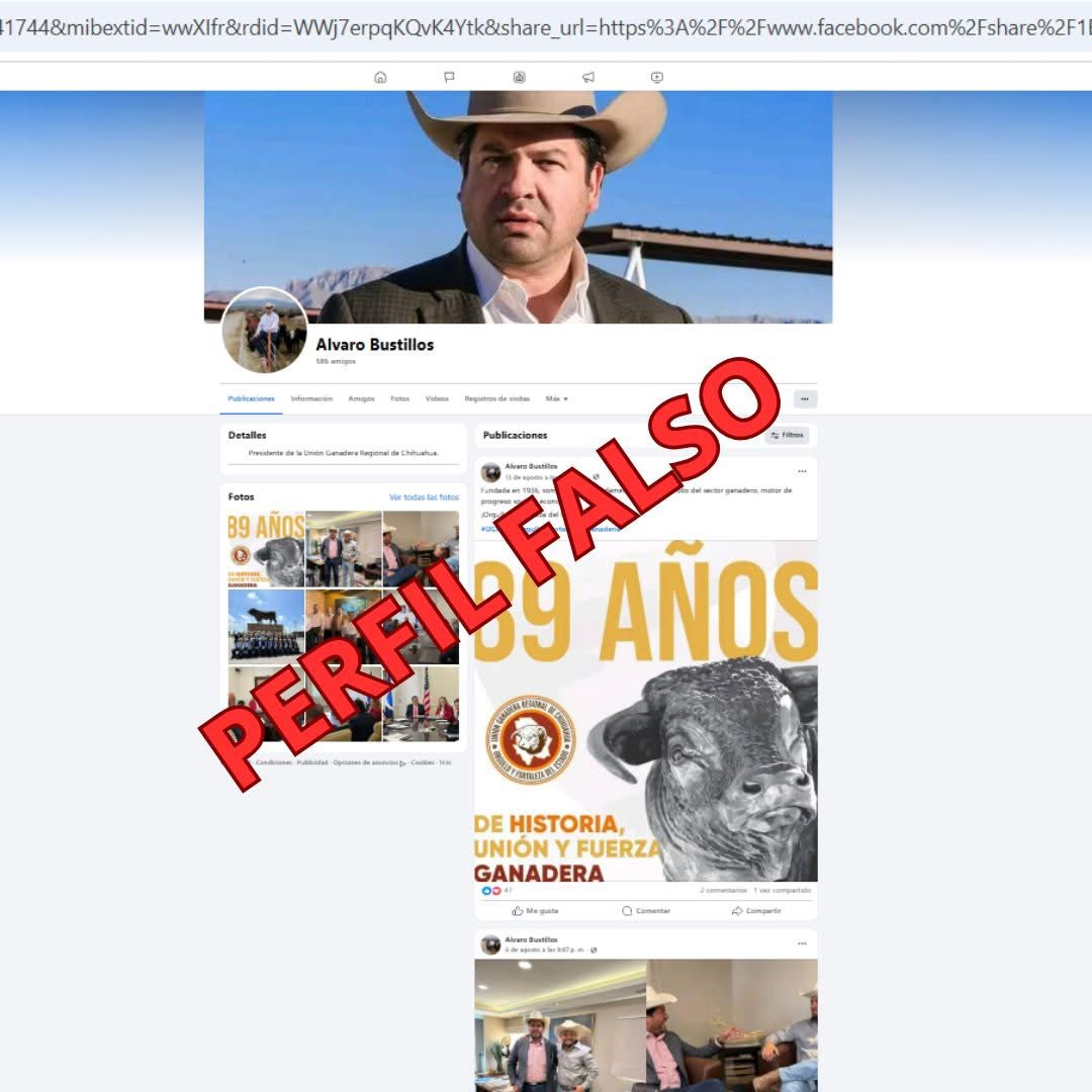 A través de un comunicado difundido en redes sociales, el presidente de la Unión Ganadera Regional de Chihuahua, Álvaro Bustillos, alertó a la ciudadanía sobre la creación de perfiles falsos que están siendo utilizados para intentar obtener información personal con fines de extorsión.