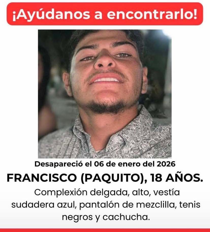 De acuerdo con la información proporcionada, Francisco Díaz tiene 18 años de edad, es de complexión delgada y de estatura alta. Al momento de su desaparición vestía una sudadera color azul, pantalón de mezclilla, tenis negros y cachucha.