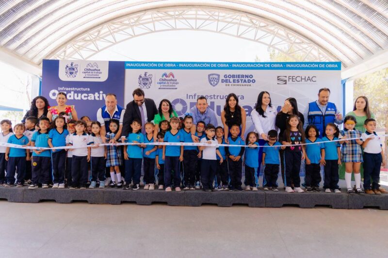 H. Ciudad de Chihuahua, Chih. A 9 de junio de 2025.- Como parte del Programa de Infraestructura Educativa en el que participan el Gobierno Municipal, Gobierno del Estado y la Fundación del Empresariado Chihuahuense (FECHAC), el alcalde Marco Bonilla y autoridades invitadas, cortaron el listón inaugural del nuevo domo construido en el Jardín de Niños Suave Patria ubicado al sur de la ciudad.