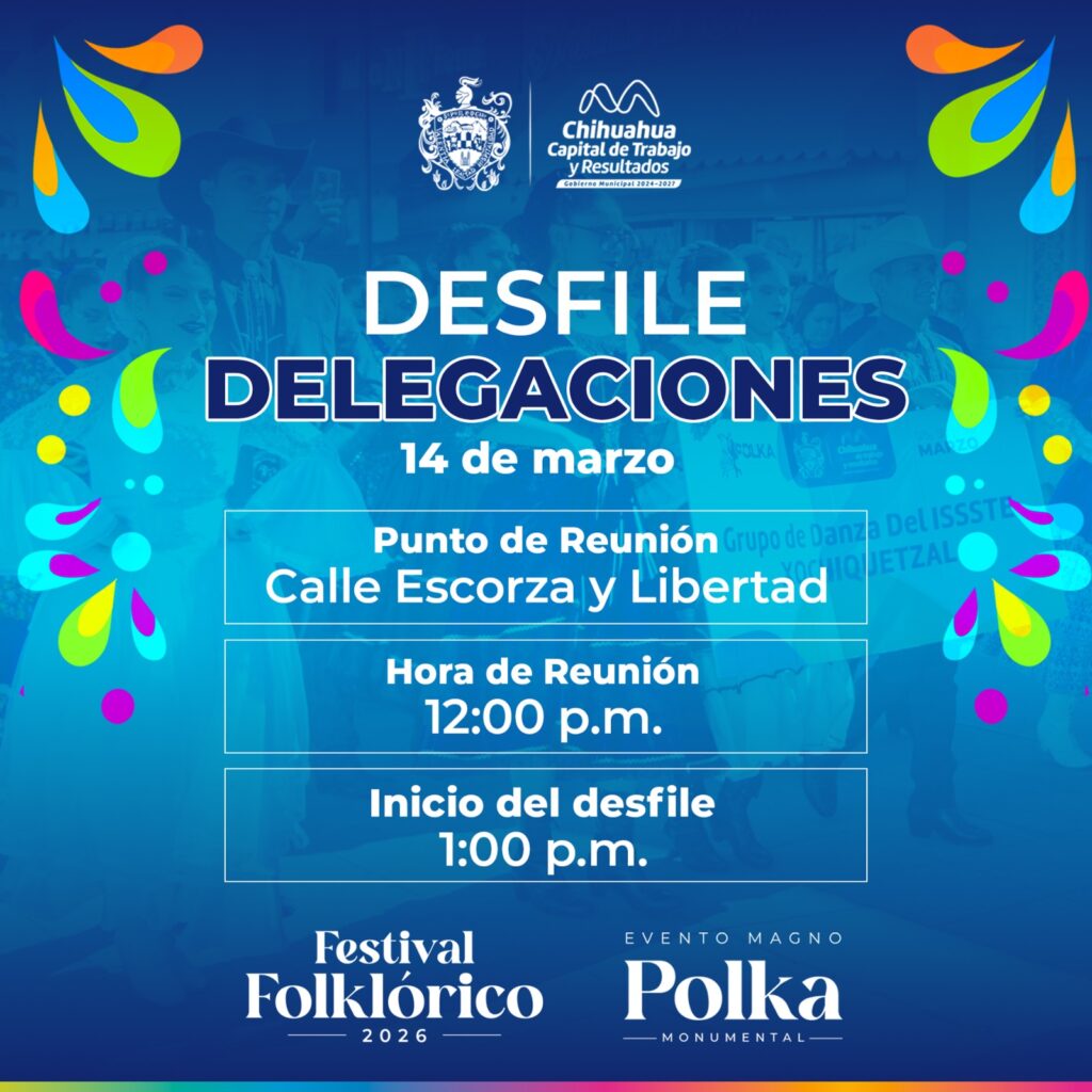H. Ciudad de Chihuahua, Chih., a 6 de marzo de 2026.- El Gobierno Municipal de Chihuahua, a través de la Dirección de Desarrollo Humano y Educación, reitera la invitación para participar en el Festival Folklórico 2026, del 13 al 15 de marzo, con actividades todo tipo como la Polka Monumental, en el marco del Día del Folklore Chihuahuense.
