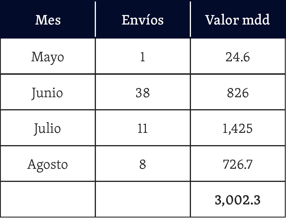 • Reducción posterior: Tras críticas de congresistas estadounidenses, los envíos cayeron drásticamente en septiembre y octubre, con apenas tres operaciones por unos 70 millones de dólares.