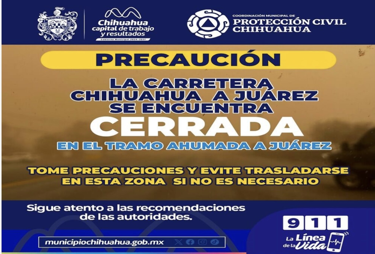 H. Ciudad de Chihuahua, Chih_.- El Gobierno Municipal de Chihuahua, a través de la Coordinación Municipal de Protección Civil, informa a la ciudadanía que la carretera Chihuahua a Ciudad Juárez se encuentra cerrada en el tramo de Ahumada -Juárez, por los vientos y tolvaneras que se presentan en la zona.