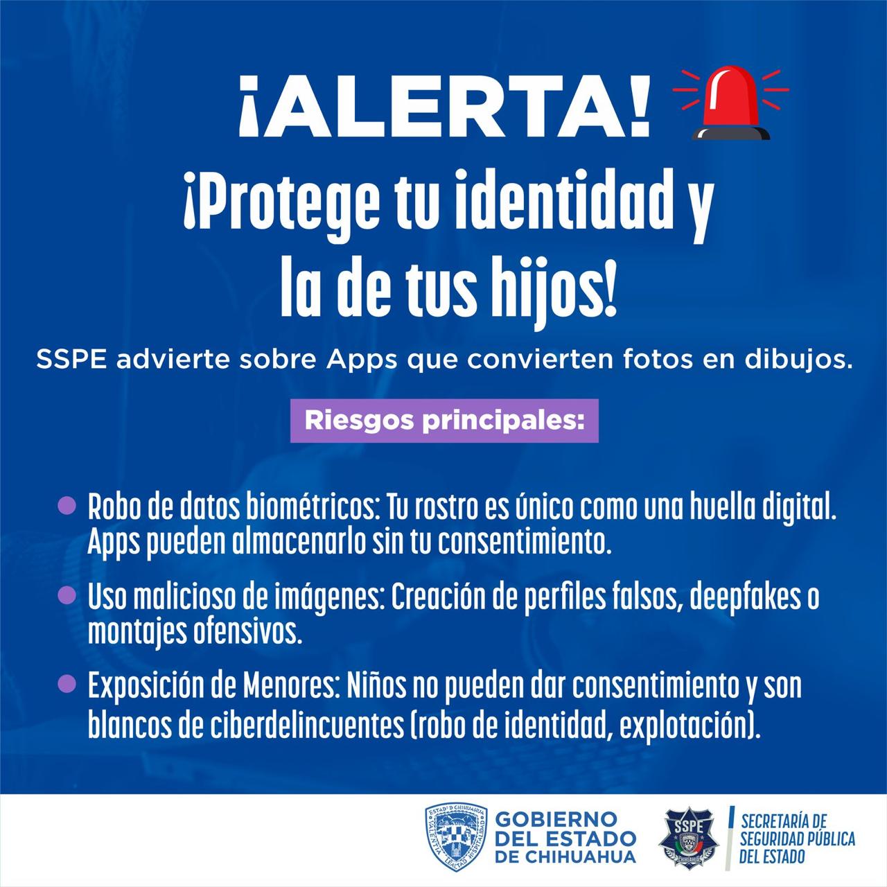 La Secretaría de Seguridad Pública del Estado (SSPE) exhortó a la ciudadanía para alertar sobre los riesgos asociados al uso de aplicaciones que convierten fotografías personales en dibujos animados o avatares, toda vez que estas plataformas pueden comprometer la privacidad y almacenar datos sensibles e incluso facilitar el robo de identidad.