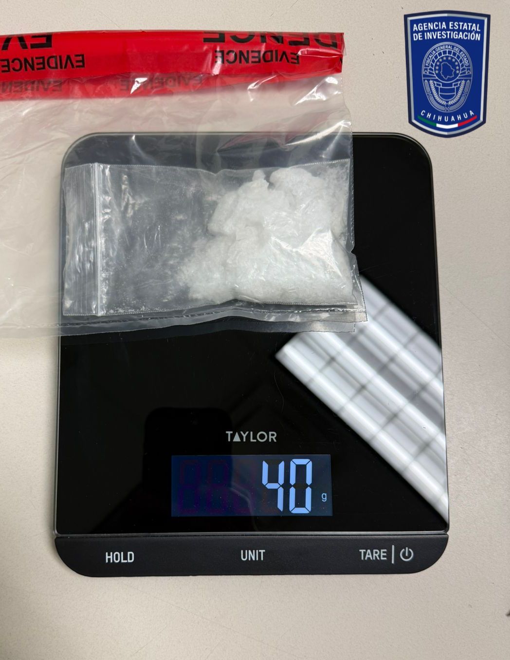 Luego de una inspección corporal, descubrieron que tenía entre sus pertenencias una bolsa de plástico tipo ziploc que contenía una sustancia química granulada con las características propias del cristal, con un peso de 40 gramos.