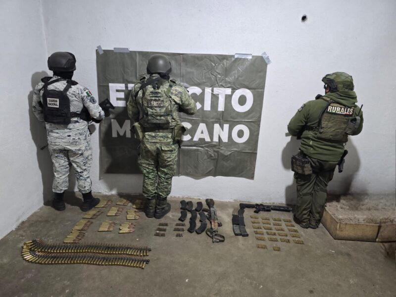 Elementos de la Secretaría de Seguridad Pública del Estado (SSPE), coordinados en la Base de Operaciones Interinstitucionales (BOI), aseguraron armamento y municiones de uso exclusivo del ejército, durante los recorridos de prevención efectuados en el poblado Chuichupa, en el municipio de Madera.