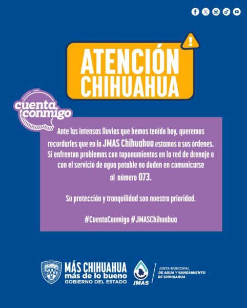 Ante las intensas lluvias que hemos tenido hoy, queremos recordarles que en la JMAS Chihuahua estamos a sus órdenes. Si enfrentan problemas con taponamientos en la red de drenaje o con el servicio de agua potable no duden en comunicarse al número 073.