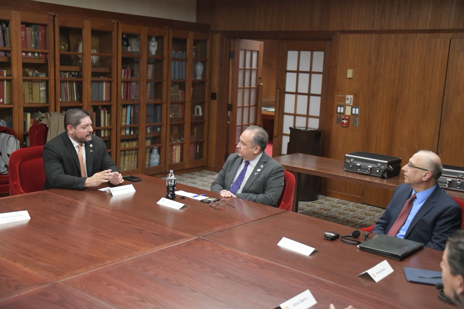 Con la finalidad de dar seguimiento a las relaciones y vinculación en materia de investigación, el rector de la UACH, maestro Luis Alfonso Rivera Campos, y el director de Investigación y posgrado, Luis Carlos Hinojos Gallardo, sostuvieron una reunión con el Vicepresidente de Investigación, Ahmad Itani y Michael Dalby, Vicepresidente de Innovación, Comercialización y Desarrollo Económico, de la Universidad de Texas en El Paso (UTEP).
