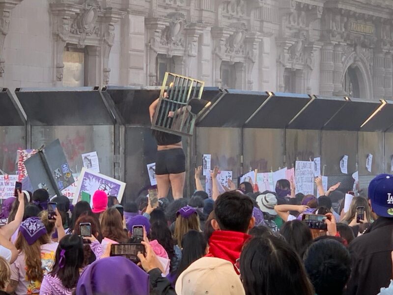 En las imágenes se observa que un integrante de la manifestación escaló por las paredes metálicas y comenzó a lanzar fuego con un spray hacía el interior, donde se encuentran los elementos de seguridad resguardando el edificio.