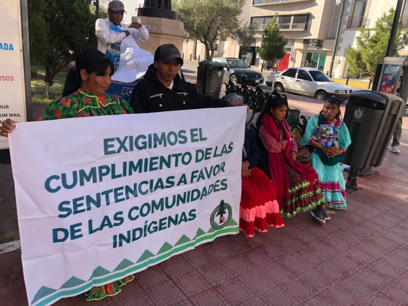 Un grupo de manifestantes se congregó frente al Palacio de Gobierno en Chihuahua para exigir que el gobierno estatal cumpla con sentencias judiciales a favor de los pueblos indígenas, en particular la comunidad de Bosques San Elia Repechique.
