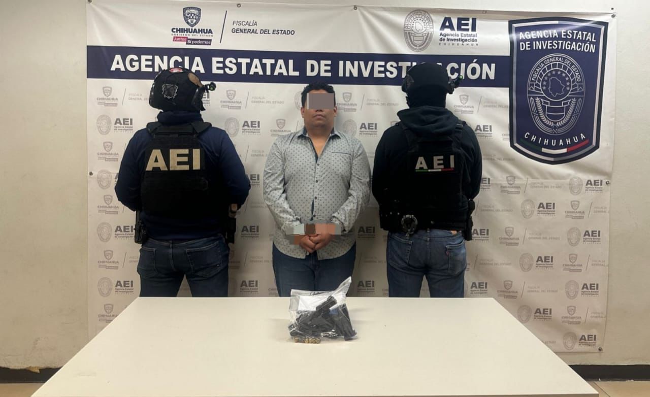 Elementos de la Agencia Estatal de Investigación de la Zona Norte, detuvieron, en los términos de la flagrancia, a Marco Antonio M. M., en posesión ilegal de un arma de fuego, en Ciudad Juárez.