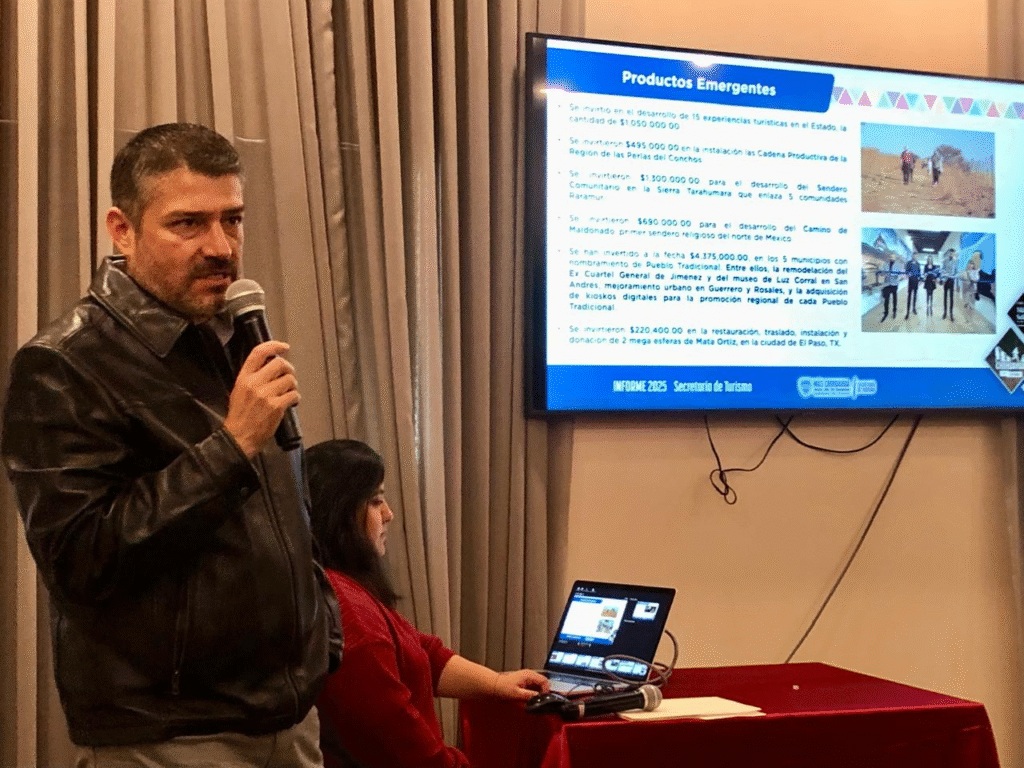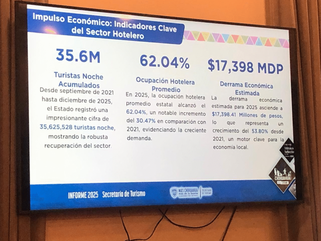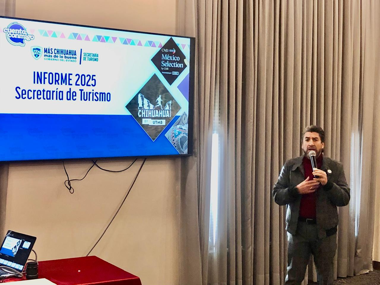 En el Informe Anual 2025 de la Secretaría de Turismo de Chihuahua, presentado este viernes, autoridades estatales como Felipe de Ibrai Gómez Gallegos, Raúl Rodríguez, Alejandra Villalobos, Enrique Toledo y María Jesús Soto destacaron que el estado ha alcanzado cifras sin precedentes en el sector turístico, consolidándose como uno de los destinos más dinámicos de México. Con 36 millones de turistas noches acumulados, una derrama económica de 17,400 millones de pesos y una ocupación hotelera promedio del 62%, Chihuahua superó los récords históricos de 2019 y se posicionó como un referente en turismo de aventura, cultural, de negocios y médico.