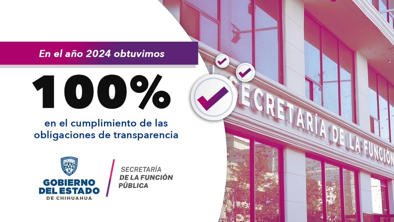 La Secretaría de la Función Pública (SFP), dio a conocer que obtuvo un resultado del 100 por ciento en cuanto a cumplimiento de las obligaciones de transparencia correspondientes al ejercicio 2024, según lo establecido en el Dictamen de Verificación realizado por el Instituto Chihuahuense para la Transparencia y Acceso a la Información Pública (Ichitaip).