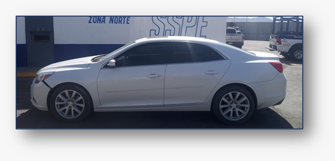 Durante la intervención, elementos de la SSPE aseguraron la camioneta robada, un vehículo General Motors Malibú modelo 2015, involucrado en los hechos, y el arma blanca utilizada en la agresión.