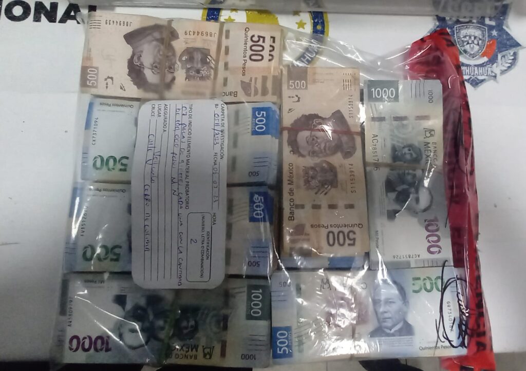 Al llevar a cabo la revisión protocolaria del automóvil, se localizó una mochila que contenía en su interior la cantidad de 700 mil pesos, que se suma al monto que fue ofrecido a los oficiales por la liberación de los detenidos, dando un total de 800 mil pesos asegurados. Las personas inspeccionadas no pudieron comprobar la procedencia lícita del dinero.