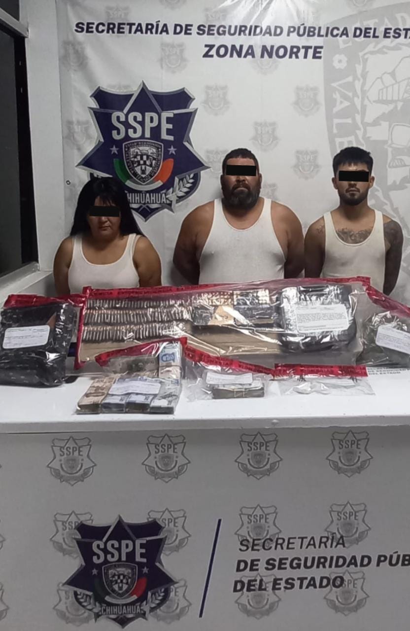 Elementos policiacos de la Secretaría de Seguridad Pública del Estado (SSPE), realizaron la detención de tres personas en posesión de 800 mil pesos de dudosa procedencia, 156 municiones utilizables y varios paquetes de droga, en calles de la colonia Lomas de San Jorge, en Ciudad Juárez.