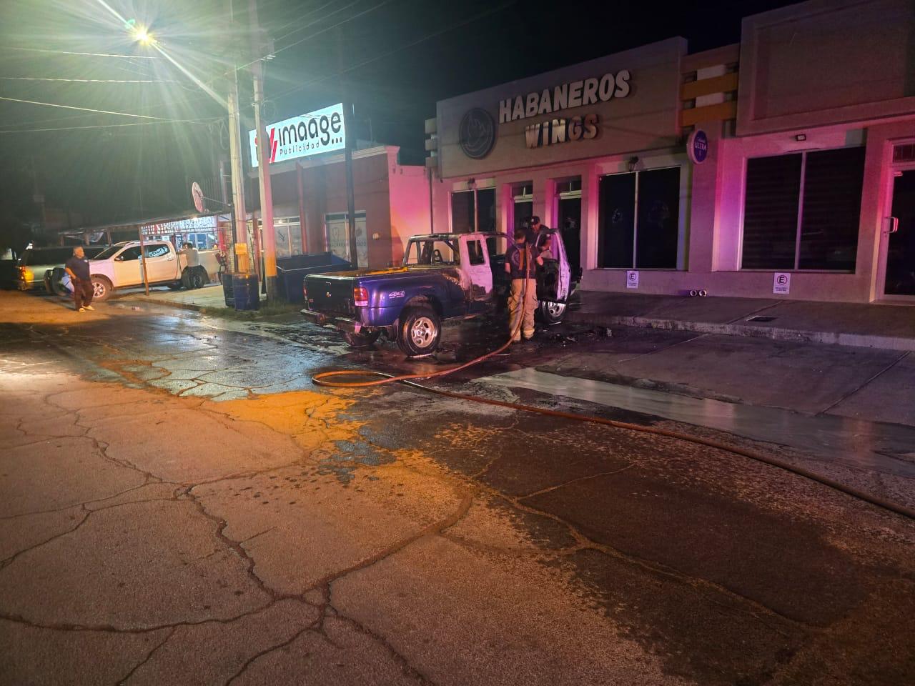 La intervención se llevó a cabo tras un reporte al número de emergencias 9-1-1, en el que alertaba sobre una camioneta Ford Ranger que fue consumida por el fuego y afectaciones en el establecimiento “Habaneros Wings”, ubicado en el cruce de las calles Libertad y 16 de Septiembre, en la colonia Centro.