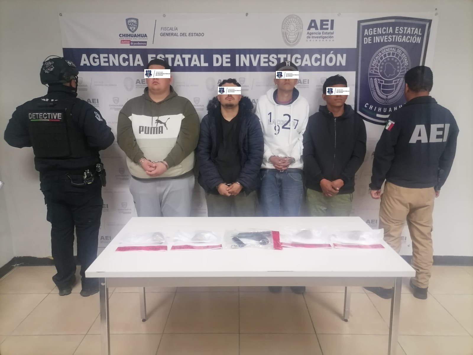 EL Grupo Especial de Detectives de la Secretaría de Seguridad Pública del Estado (SSPE), detuvieron en flagrancia a un grupo de 4 sujetos por portación ilegal de armas de fuego y delitos contra la salud, en calles de Ciudad Juárez.