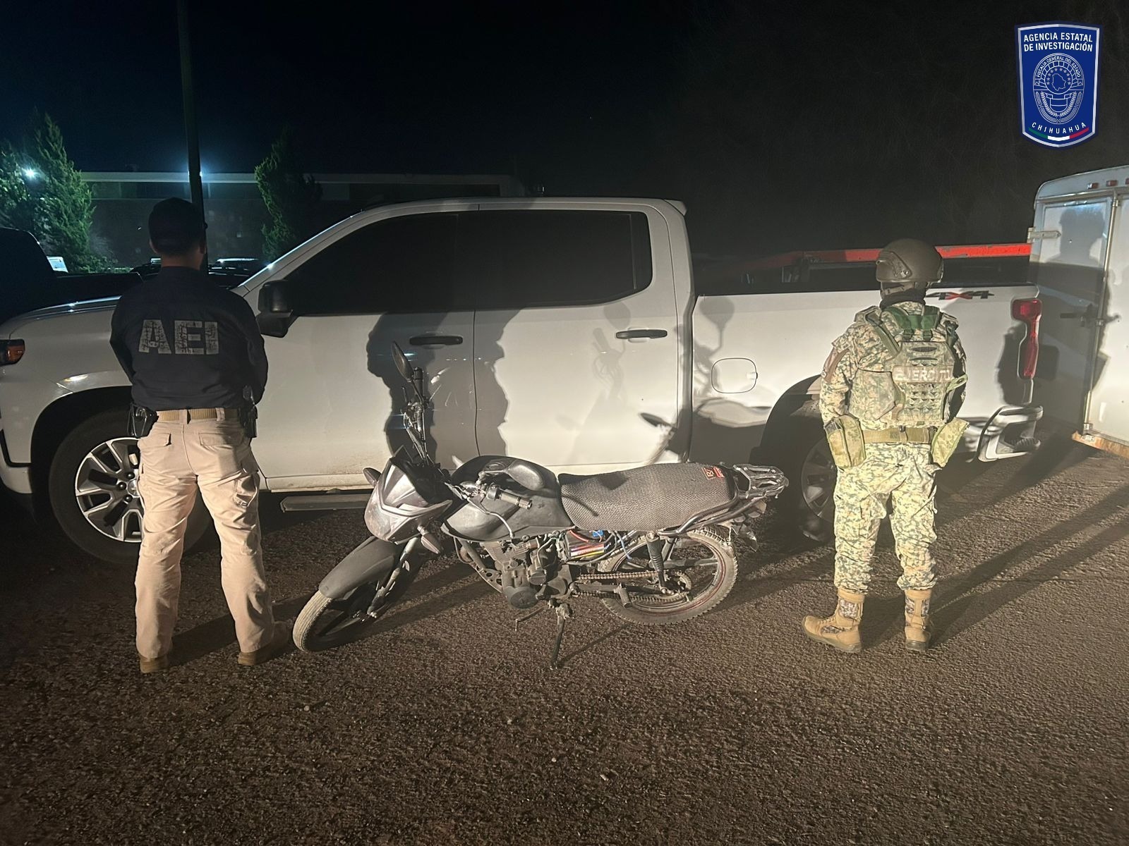 Elementos de la Agencia Estatal de Investigación, quienes participan junto con personal del Ejército Mexicano en el operativo de prevención y vigilancia, detuvieron a Luis Arturo R. Q., de 27 años en posesión de una motocicleta con reporte de robo.