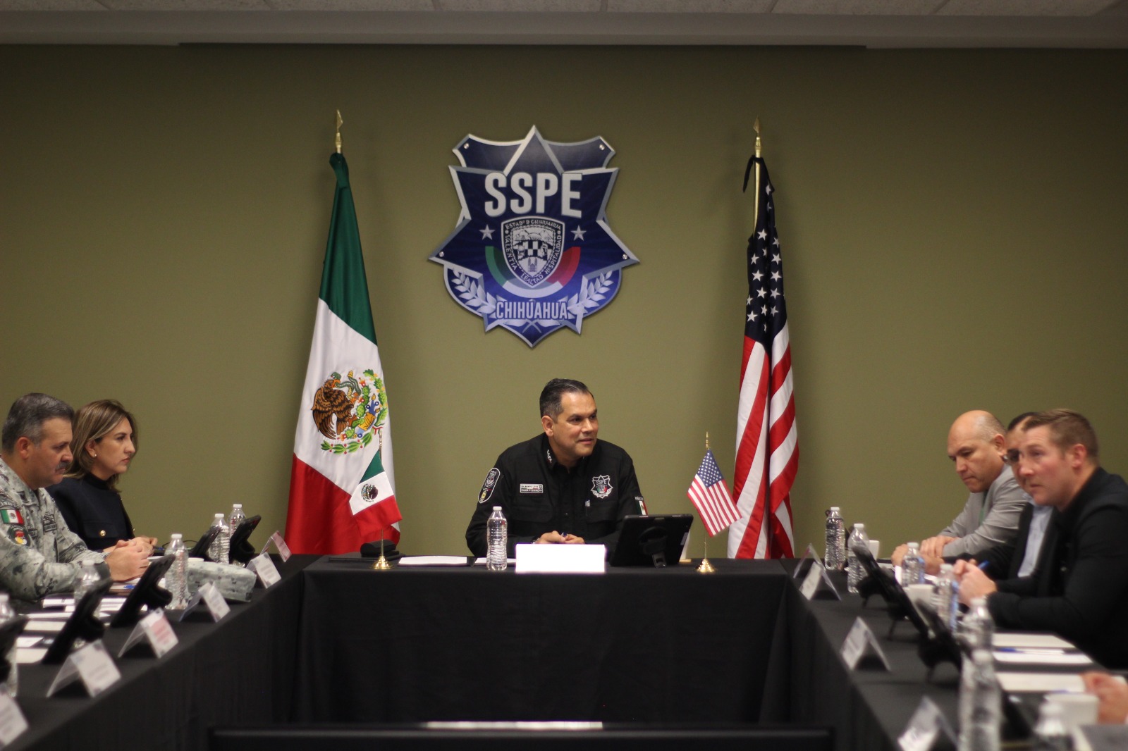 El encuentro se llevó a cabo en las oficinas centrales de la Secretaría de Seguridad Pública Estatal en Ciudad Juárez y contó con la participación de Abraham Meléndez, supervisor de USBP; Gil Alfaro, de JTFB; David Silva, vicecónsul; Félix Herrera, cónsul adscrito; Zayra Carrasco Flores, titular del INM; José Luis Santos Iza, coronel de la Guardia Nacional.
