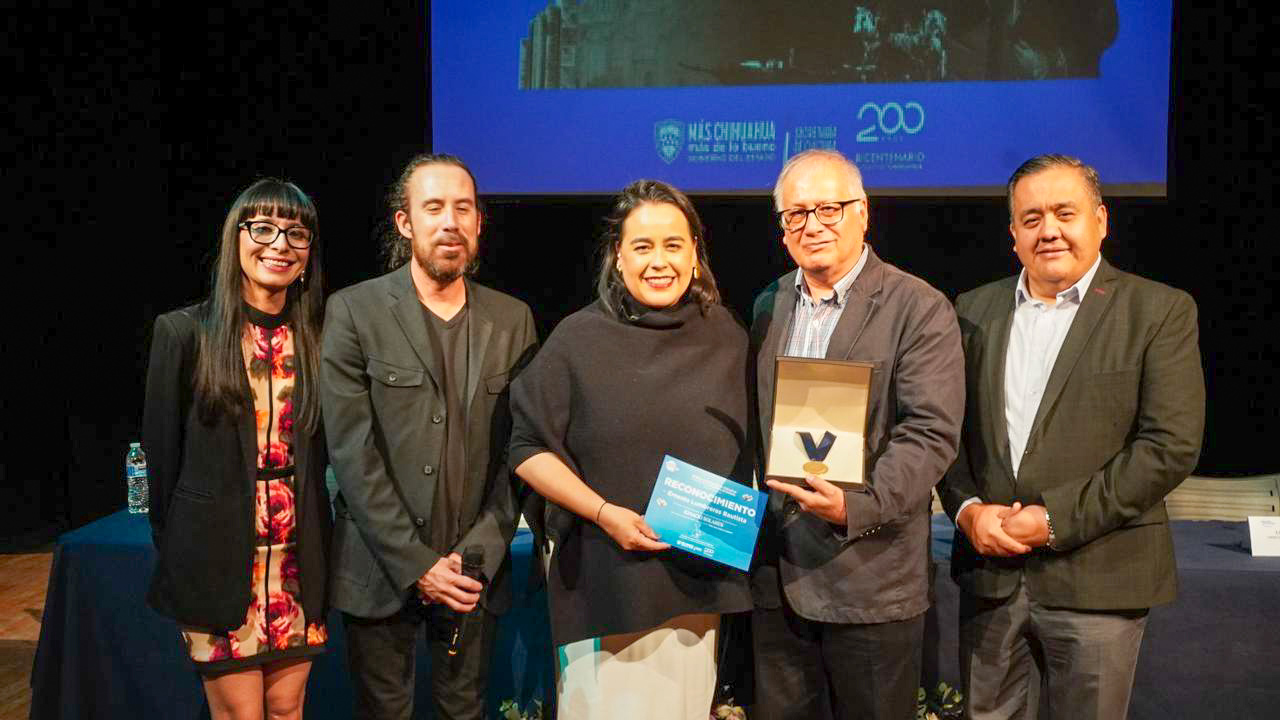 En ceremonia efectuada en el Teatro Experimental “Octavio Trías”, en el Centro Cultural Paso del Norte, de Ciudad Juárez, el literato recibió la presea de manos de la secretaria de Cultura, Alejandra Enríquez Gutiérrez.