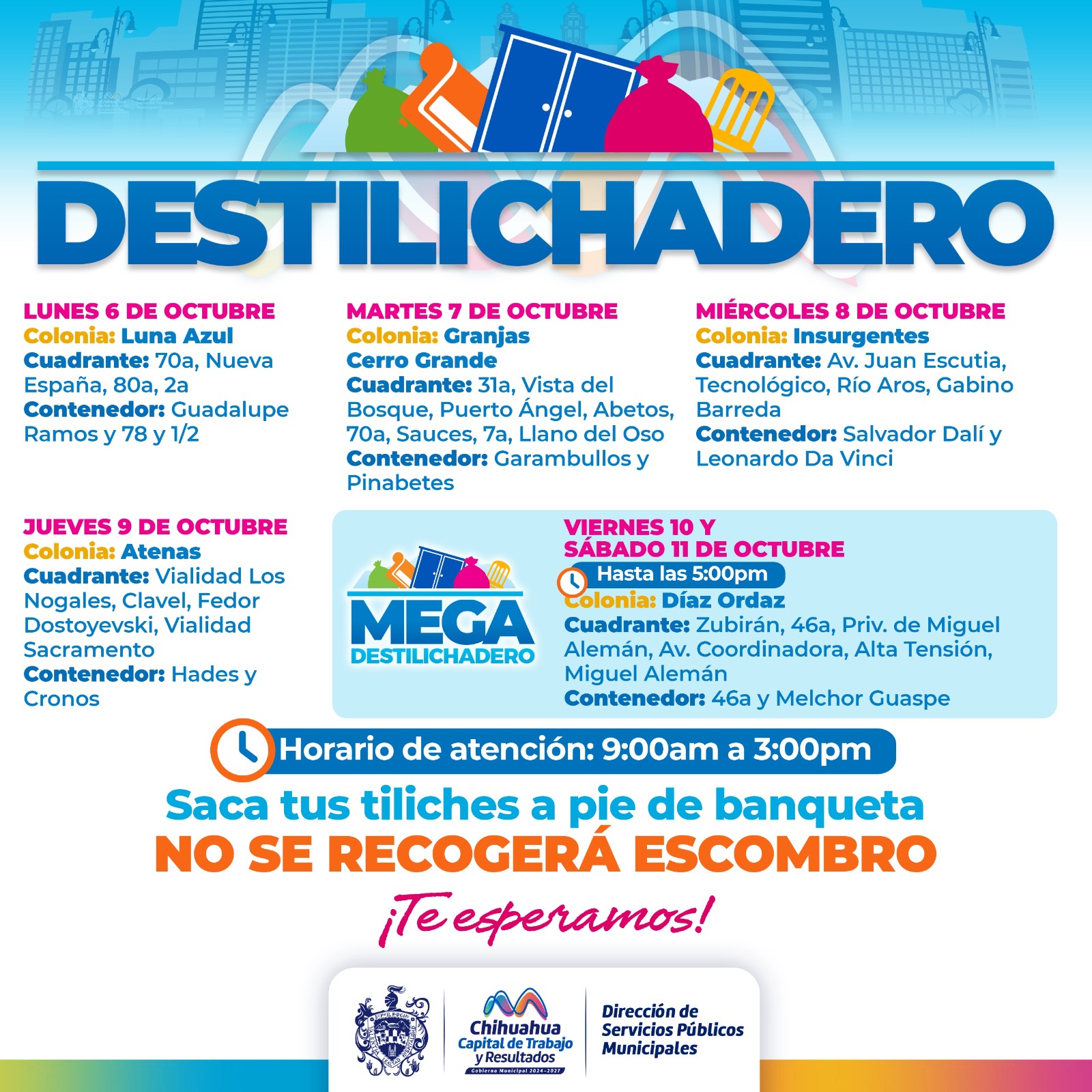 H. Ciudad de Chihuahua, Chih. A 4 de octubre de 2025.- Para evitar acumulaciones de basura de grandes dimensiones en las viviendas, que podría generar plagas o problemas de salud, el Gobierno Municipal, a través de la Dirección de Servicios Públicos Municipales, informa el calendario del programa Destilichadero, que se realizará 6 al 11 de octubre en cinco colonias de la Capital.