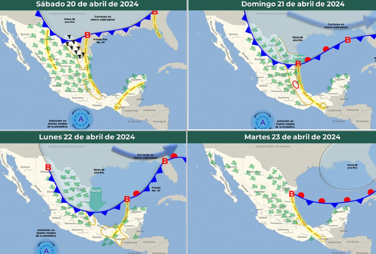 Para este sábado 20 el frente frio numero 43 sobre la frontera norte y noreste en interacción con la corriente en chorro, un canal de baja presión y una circulación en niveles medios de la atmósfera favorecerá ambiente de fresco a templado por la mañana, caluroso por la tarde, temperaturas frías en la zona serrana, cielo despejado.