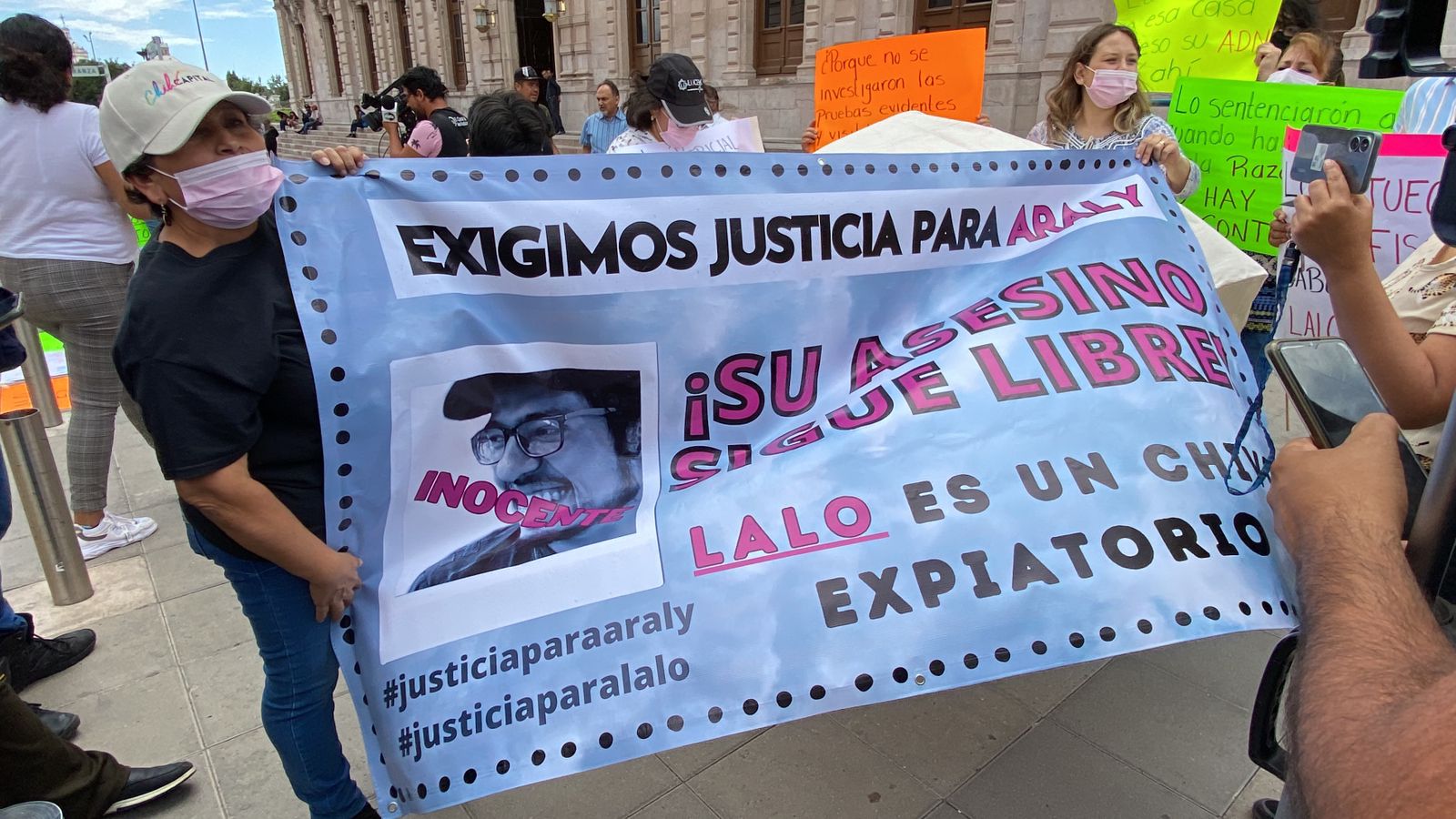 La mañana de este miércoles, familiares de Eduardo R.G., se manifestaron frente a Palacio de Gobierno por la avenida Libertad para exigir “justicia para Lalo”, quien fue sentenciado por el feminicidio de Araly.