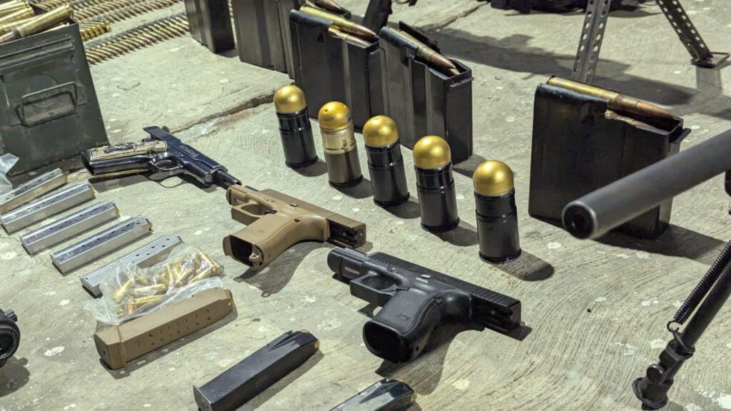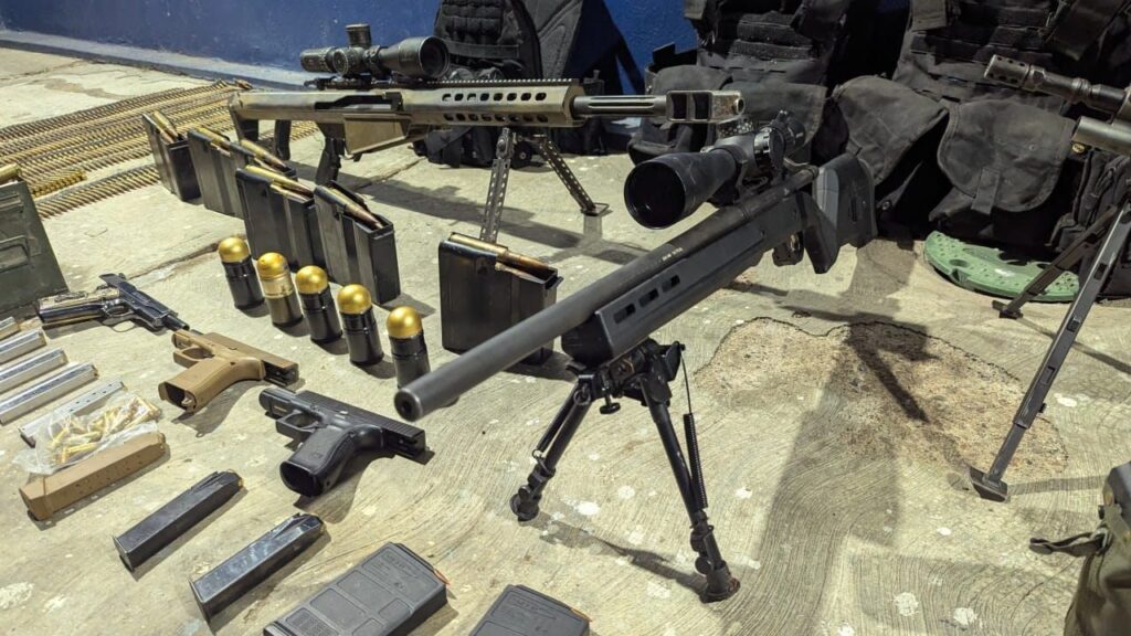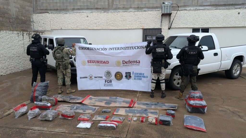Además, se decomisaron cuatro granadas, un dron con seis baterías, equipo táctico con placas balísticas, radios de comunicación, 186 dosis de presunta cocaína y 1 millón 100 mil pesos en efectivo.