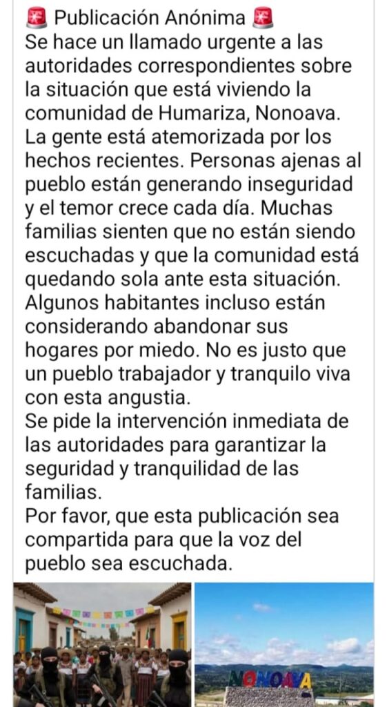 — A través de una publicación difundida de manera anónima en redes sociales, habitantes del municipio de Nonoava hicieron un llamado urgente a las autoridades de los tres órdenes de gobierno ante el clima de inseguridad que, aseguran, persiste en la región.
