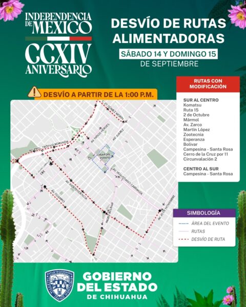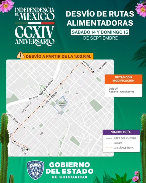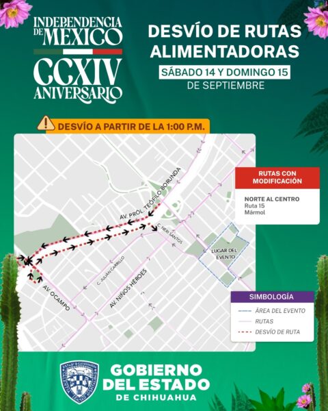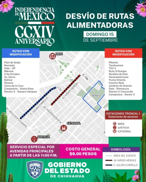 El 15 de septiembre habrá cambio en las siguientes rutas a partir de las 18:00 horas: Riberas, Tarahumara, Tec II por Colón, Tec II por Industrial, Ruta 3, Mármol, Dale, Ramiro Valles, 02 de Octubre, Jardines, Camino Real, Punta Oriente y Campesina.