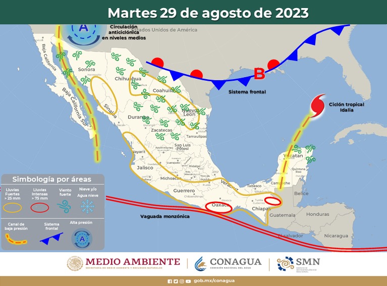 Con base en información emitida por el Servicio Meteorológico Nacional (SMN), la CEPC informó que este fenómeno, en combinación con la humedad del monzón mexicano, ocasionará precipitaciones moderadas a dispersas con intervalos de chubascos.