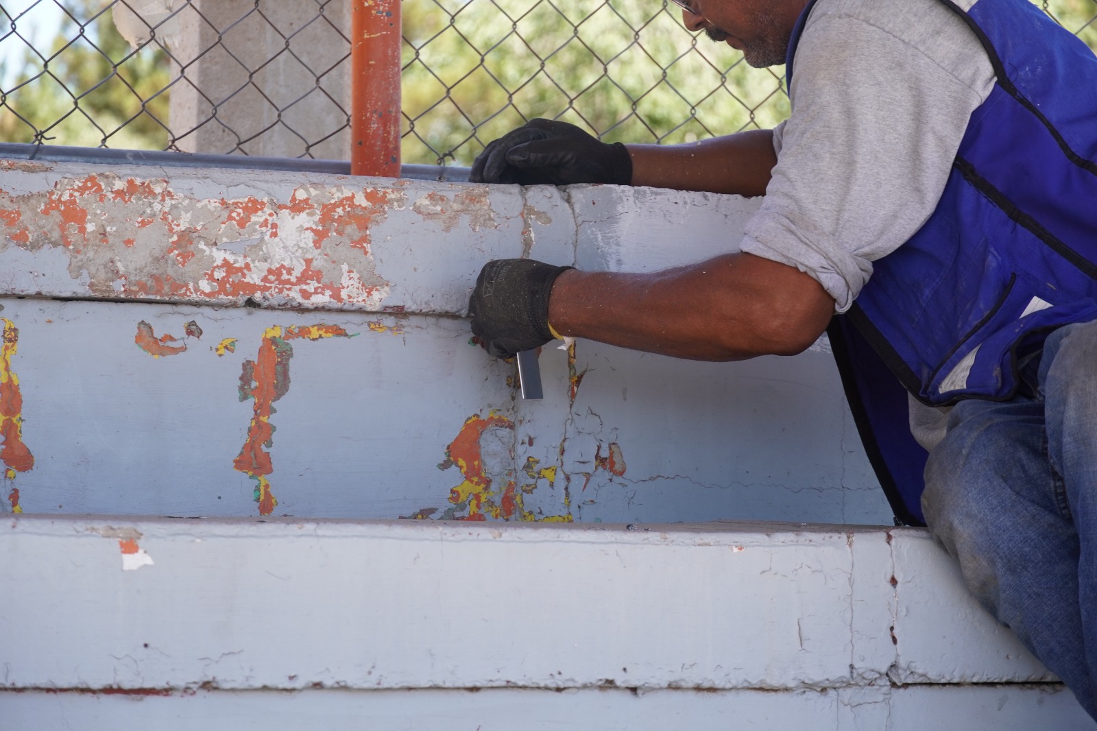 Entre las labores iniciales se encuentra la atención a la pintura actual de las gradas, así como la preparación del terreno para el ingreso de la maquinaria y el desarrollo profundo de los trabajos.