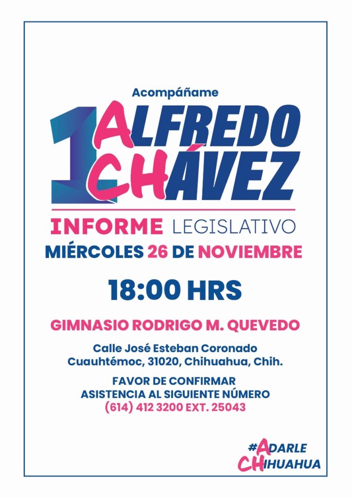 Chihuahua, Chih.- El diputado por el Distrito 18 y coordinador del Grupo Parlamentario del PAN en el Congreso del Estado, Alfredo Chávez Madrid, invitó a las y los chihuahuenses a participar en la presentación de su Informe de Actividades Legislativas, que se realizará el miércoles 26 de noviembre a las 6 de la tarde en el Gimnasio Rodrigo M. Quevedo. Señaló que este ejercicio busca mantener cercanía con la ciudadanía y rendir cuentas de manera clara.