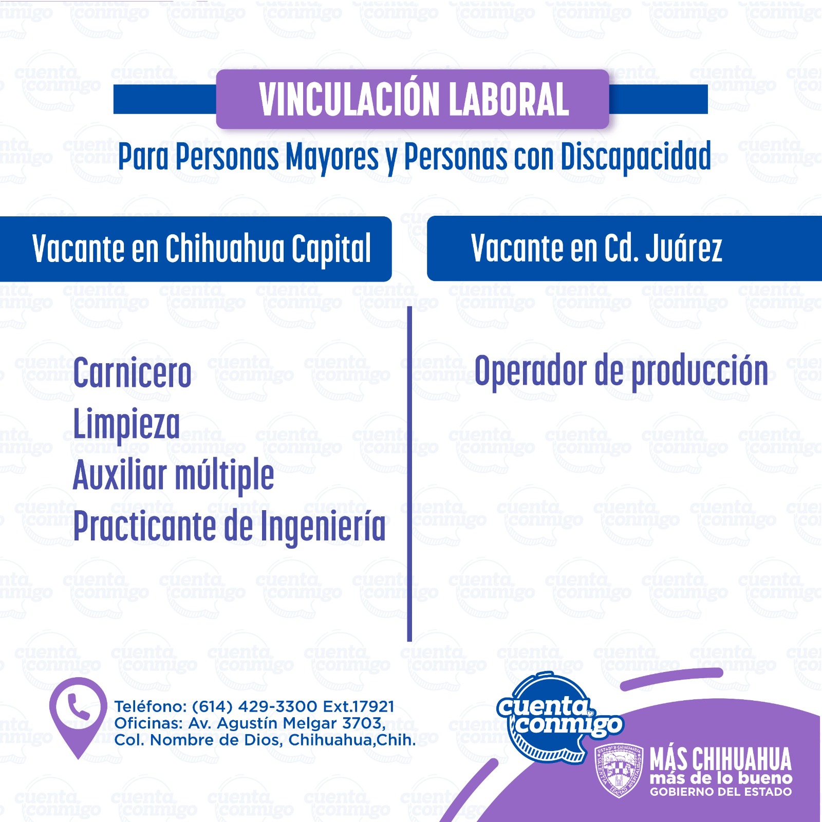 Rafael Loera, titular de la dependencia, informó que en la ciudad de Chihuahua cuentan con varias oportunidades, entre las que se encuentran el puesto de carnicero, personal de limpieza, auxiliares múltiples y practicantes de ingeniería. En Ciudad Juárez actualmente existen vacantes para operadores de producción.