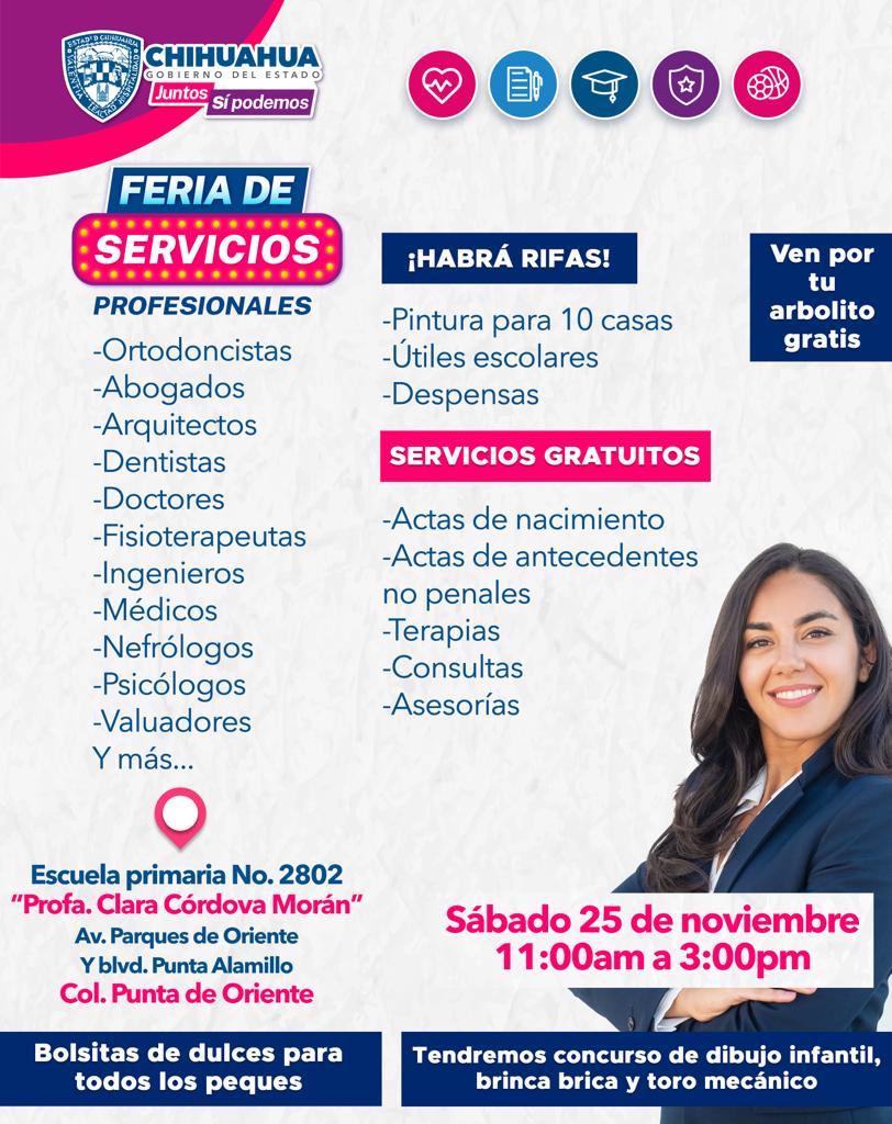Además de los servicios de los colegiados, el Gobierno del Estado otorgará actas de nacimiento y de no antecedentes penales, terapias, consultas y asesorías, con la participación de las secretarías, de Salud, de Desarrollo Humano y Bien Común, de Seguridad Pública Estatal, Fiscalía General del Estado, Junta Municipal de Agua y Saneamiento de Chihuahua, Comisión Estatal de Vivienda, Suelo e Infraestructura y el Instituto Chihuahuense de la Mujer.