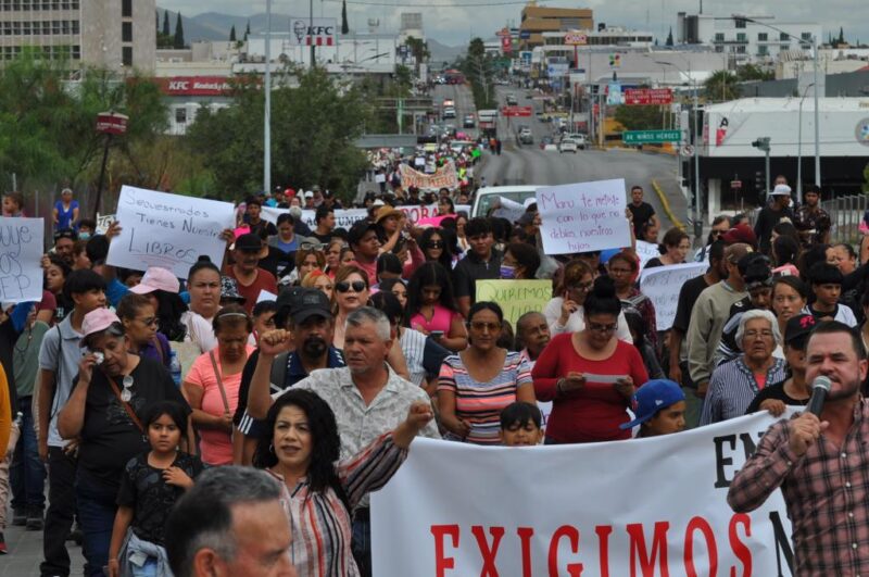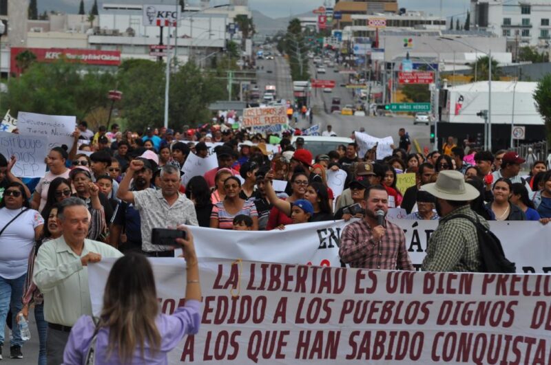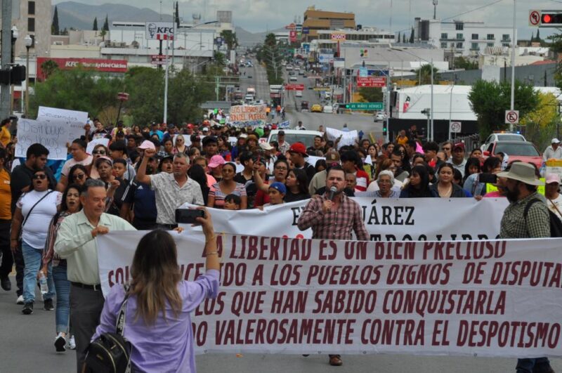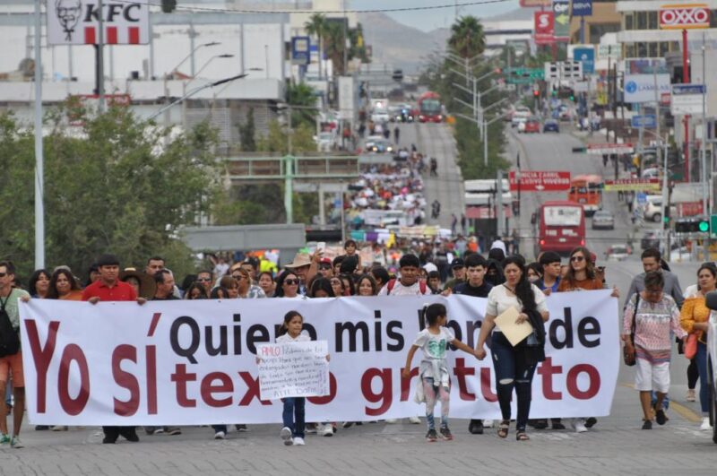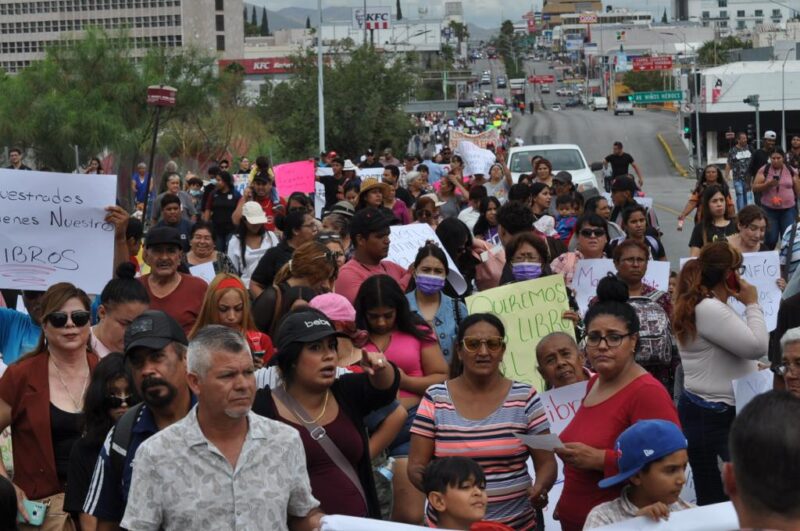 Fueron decenas de manifestantes los que llegaron esta mañana a Palacio de Gobierno, quienes desde tempranas horas se reunieron en la glorieta de Pancho Villa para emprender su marcha hasta el primer cuadro de la ciudad, con el objetivo de pedir a las autoridades chihuahuenses que entreguen los libros de texto gratuitos que fueron entregados por la Secretaría de Seguridad Pública.