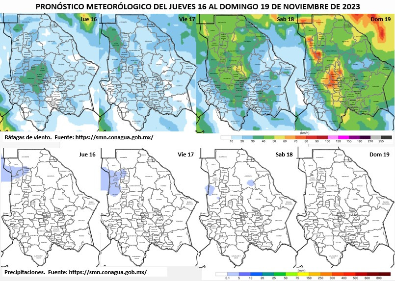 Para el día viernes 17 de noviembre se pronostican rachas de viento que pudieran superar los 55 km/h en Juárez, Ahumada, Ascensión, Janos, Casas Grandes, Nuevo Casas Grandes, Madera, Galeana, Ignacio Zaragoza, Madera, Buenaventura, Namiquipa, Temósachic, Matachí, Guerrero, Carichí, Cuauhtémoc, Riva Palacio y Chihuahua.