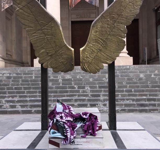 Los guardias de seguridad del Palacio de Gobierno de Chihuahua tomaron nota de un inusual hallazgo frente al edificio estatal, específicamente en las llamadas “Alas de México”. Se descubrió un atuendo indígena envuelto en lonas sobre la escalinata ubicada en la calle Libertad entre Carranza y Vicente Guerrero.