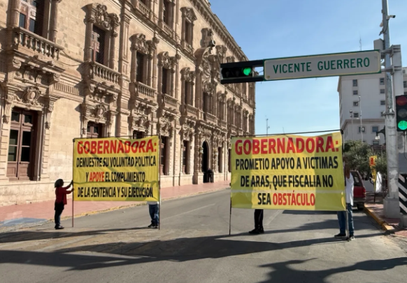 Este lunes, un grupo de personas afectadas por la empresa Aras se manifestó frente a Palacio de Gobierno, en el Centro de la ciudad, bloqueando la calle Aldama para exigir claridad en el proceso legal contra la firma financiera.