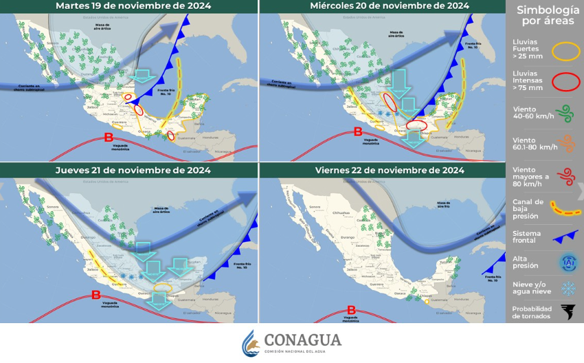 La masa de aire polar que impulsa al frente frío número 10, en interacción con la corriente en chorro subtropical y la entrada de aire húmedo procedente del Océano Pacífico, favorecerán ambiente frío por la mañana, de templado a cálido por la tarde, temperaturas de muy frías a gélidas en la zona serrana, cielo despejado.