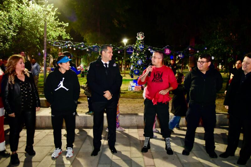 El programa incluyó palabras de bienvenida a cargo del secretario de Seguridad Pública, Gilberto Loya Chávez, seguido por el encendido del árbol.