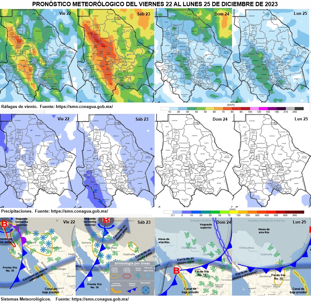 Se esperan temperaturas muy frías con heladas en la zona serrana, cielo de mayormente despejado a parcialmente nublado, vientos de 10 a 25 km/h, con rachas que pueden superar los 65 km/h en partes de las zonas noroeste, oeste, suroeste y centro, incluye: Ignacio Zaragoza, Gómez Farías, Carichí, Nonoava, San Francisco de Borja y Majalca; pueden superar los 55 km/h en partes de las zonas noroeste, oeste, suroeste y centro, incluye: Ascensión, Janos, Casas Grandes, Buenaventura, Temósachic, Guerrero, Bocoyna, Guachochi, Balleza, Cuauhtémoc, Riva Palacio y Chihuahua; pueden superar los 45 km/h en partes de las zonas norte, noroeste, oeste, suroeste, centro y sureste, incluye: Juárez, Ahumada, Ascensión, Nuevo Casas Grandes, Galeana, Ocampo, Maguarichi, Guadalupe y Calvo, Rosales, Parral, Allende, Jiménez, Camargo, La Cruz y San Francisco de Conchos; pueden superar los 35 km/h en partes de las zonas norte, oeste, suroeste, centro, sureste y este, incluye: Guadalupe, Moris, Urique, Batopilas, Belisario Domínguez, López, Coronado y El Oasis. Las ráfagas de los fuertes vientos pueden ocasionar tolvaneras en partes de Janos, Casas Grandes, Ignacio Zaragoza, Guerrero, Carichí y Majalca.