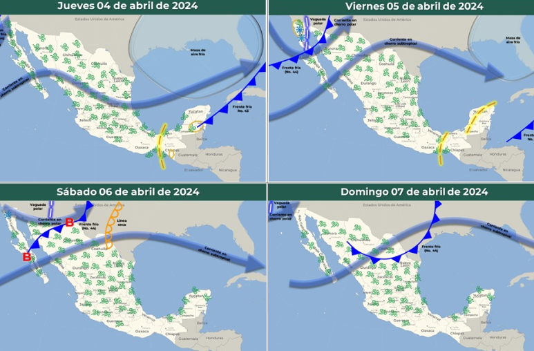 Para este jueves 4 la masa de aire frio que impulsó al frente frio número 43 en interacción con un canal de baja presión y la corriente en chorro subtropical así como la aproximación de un nuevo frente frio al noroeste del país asociado con una vaguada polar y la corriente en chorro polar favorecerá ambiente frio por la mañana, de cálido a poco caluroso por la tarde, temperaturas de gélidas a muy frías con heladas en la zona serrana, cielo despejado.