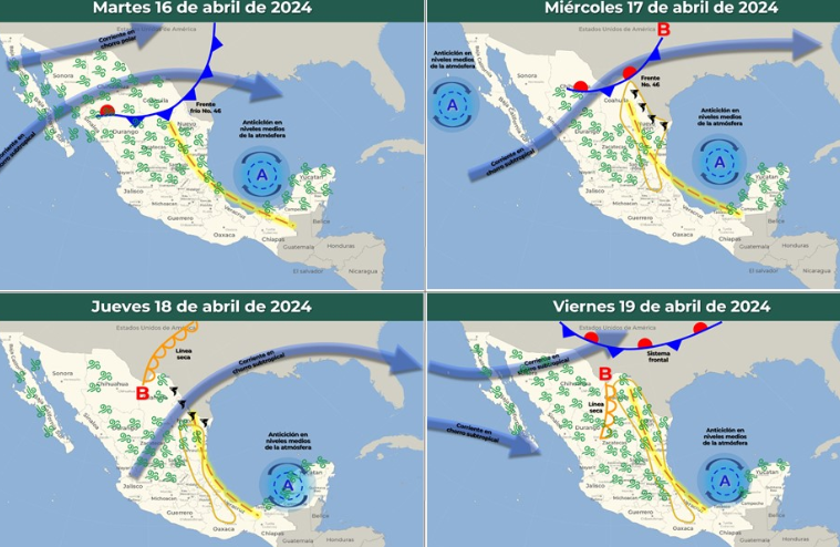 Para este martes 16 el frente frio número 46 y su masa de aire frio asociada en interacción con la corriente en chorro subtropical, un canal de baja presión y una circulación anticiclónica en niveles medios de la atmosfera favorecerá ambiente fresco por la mañana, de poco caluroso a caluroso por la tarde, temperaturas de muy frías a frías con algunas heladas en la zona serrana, cielo de parcialmente nublado a nublado.
