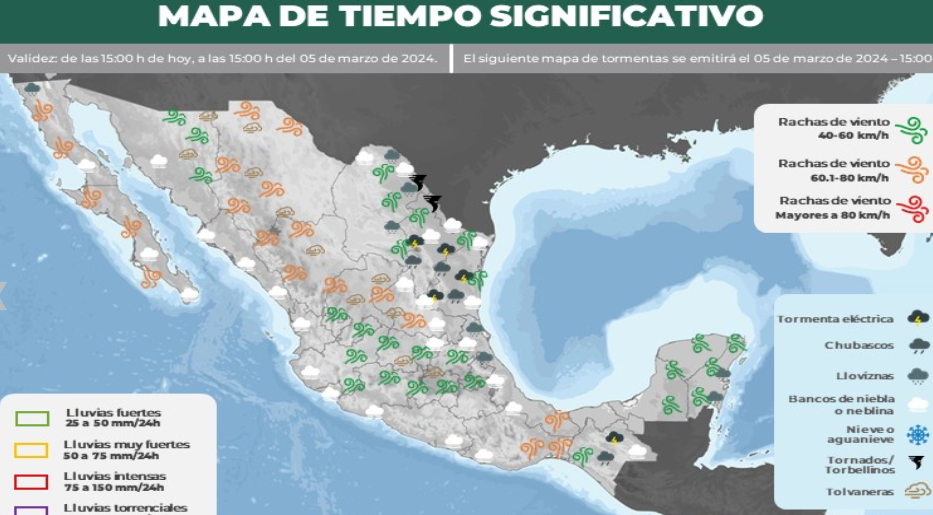 Vientos de 10 a 20 km/h, con rachas que pueden superar los 45 km/h en partes de la zona sur, incluye: Satevó; pueden superar los 35 km/h en partes de las zonas noroeste, oeste, suroeste, centro y sur, incluye: Ascensión, Janos, Casas Grandes, Nuevo Casas Grandes, Temósachic, Guerrero, Bocoyna, Carichí, Guachochi, Guadalupe y Calvo, Balleza, Nonoava, San Francisco de Borja, Cusihuiriachi, Cuauhtémoc, Riva Palacio, Chihuahua, Valle de Zaragoza, Parral y Santa Bárbara. Sin lluvias.