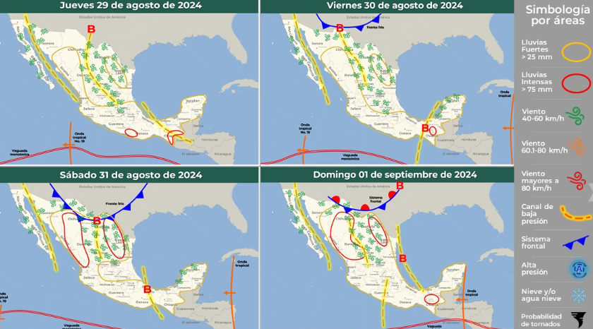 Para este jueves, el monzón mexicano en interacción con divergencia en altura, un canal de baja presión y el ingreso de humedad procedente del Océano Pacifico y Golfo de México, favorecerán ambiente de templado a cálido por la mañana, de caluroso a muy caluroso por la tarde, temperaturas de frías a frescas en la zona serrana, cielo de parcialmente nublado a nublado.